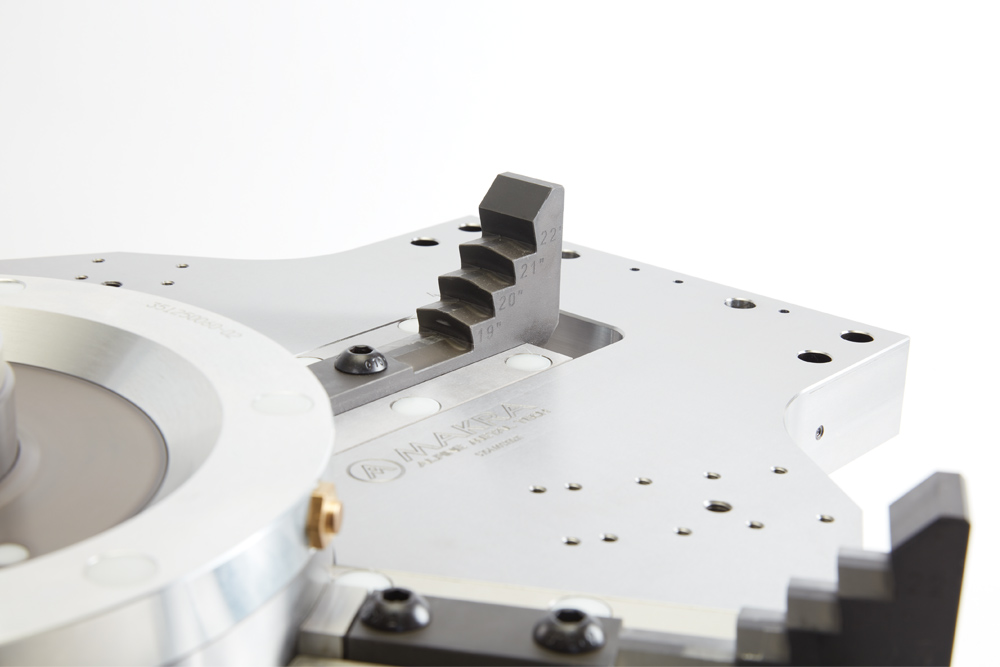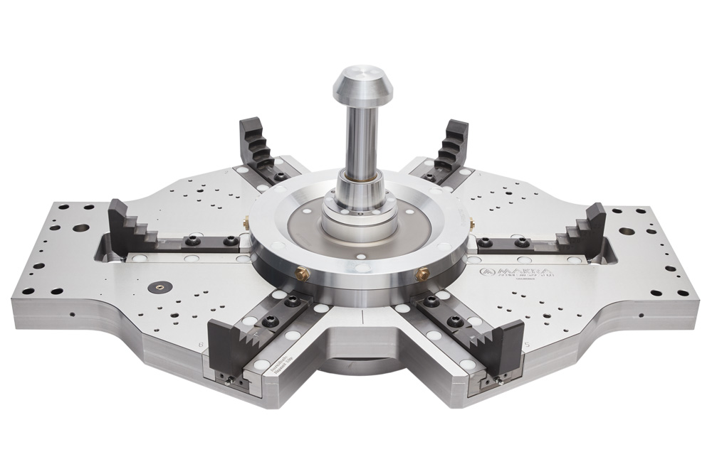 这种桥式装夹是为了在三序加工期间夹紧铝车轮而开发的。可更换的夹爪无需调整可实现多达四种不同尺寸车轮的混线加工。车轮从外侧夹在已经加工过的背部轮缘上,因此可以实现最小的允许偏差。由于平面的设计,可以旋转到气门孔。中心孔的支撑油缸可防止操作过程中的振动,并确保最佳的加工效果。