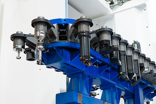 The machine is equipped with one B-Axis Multifunctional Head. This head is used for milling and drilling with its own electro spindle, but in order to perform turning operation, the head has a hydraulic system which locks the spindle and the bearings in order to obtain one strong turning tool holder.