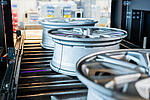 The space-saving and low-maintenance inline design makes it possible to retrofit the MD380 into almost any existing production line. Only three conventional straight roller table segments are required. The wheel ID is transferred from the roller table control to the MD380. As soon as the wheel has been fed into the machine, it is centered and the pre-positioned high-resolution line sensor begins the scanning process. Immediately after the scan has been completed, the measured wheel and the following wheel are conveyed in and out in parallel.