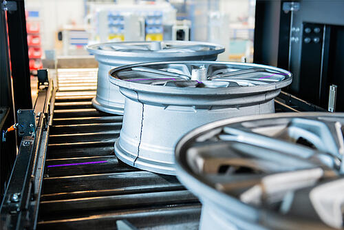Fully integrated 3D laser measurement technology makes it possible to analyze aluminum raw cast wheels directly in the production flow and to incorporate findings directly into the casting process.