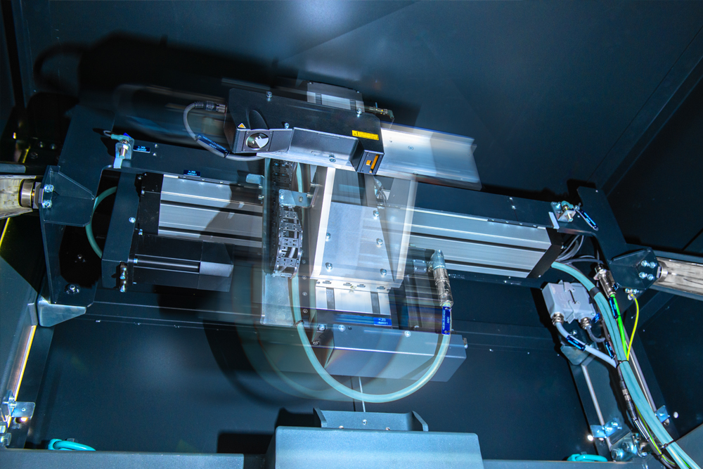 The space-saving and low-maintenance inline design makes it possible to retrofit the MD380 into almost any existing production line. Only three conventional straight roller table segments are required. The wheel ID is transferred from the roller table control to the MD380. As soon as the wheel has been fed into the machine, it is centered and the pre-positioned high-resolution line sensor begins the scanning process. Immediately after the scan has been completed, the measured wheel and the following wheel are conveyed in and out in parallel.