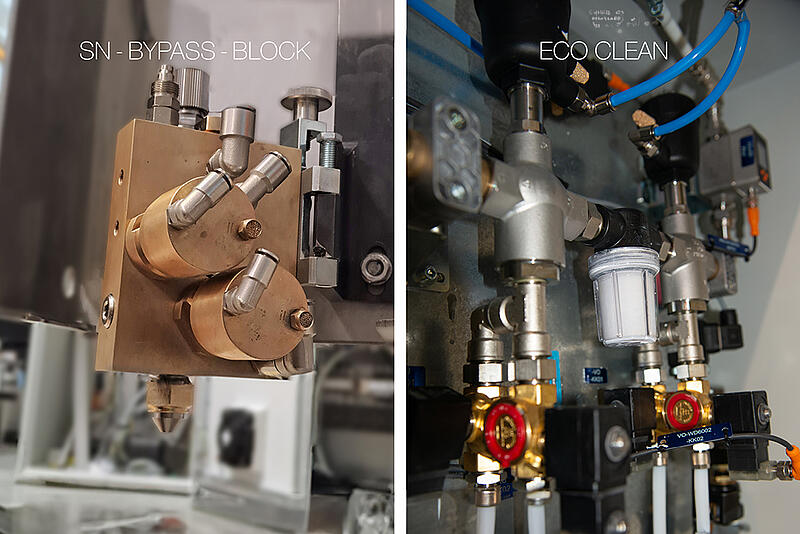 Mit dem AMT Eco Clean wird die automatische Filterspülung vorbeugend gegen Unregelmäßigkeiten im Farbsystem eingesetzt, während der SN-Bypass-Block die Wartungsarbeiten rationalisiert und die Qualität der Markierung auf ein neues Niveau hebt.