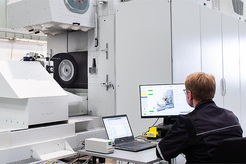 The AZN machine performs fatigue and endurance tests on aluminum car and light truck wheels by rolling them on a coated load drum. With a standard tire resting on the load roller, radial, tangential and lateral load forces can be simulated.