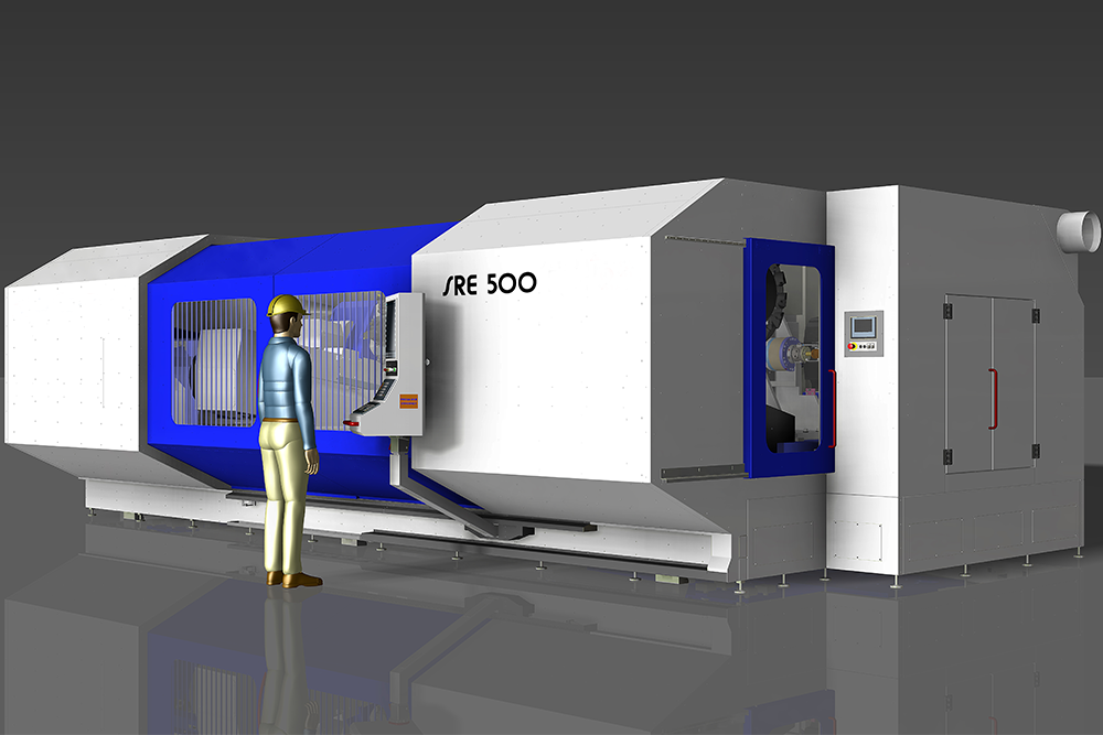 Die SRE 500 ist eine leistungsstarke horizontale Schwerlastdrehmaschine für die Bearbeitung von Eisenbahnachsen. Der Einsatz dieser Maschine kann für Schrupp- und Schlichtbearbeitungen je nach Bedarf angepasst werden.