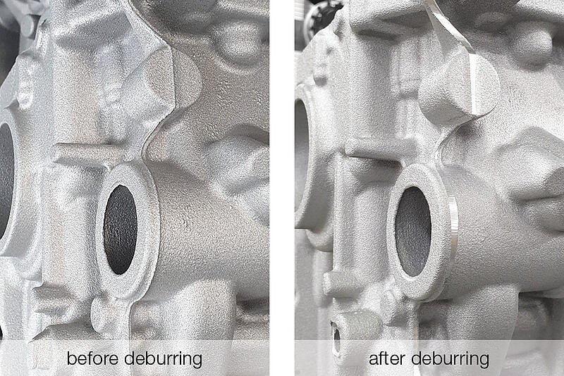 Casted aluminum parts, especially for the automotive industry, require high surface quality. Machining flashes, casting burrs, or sharp edges are not acceptable at many applications. Deburring and the teach-in process are currently carried out manually. As a result, every part looks different. The flexible robot deburring system ADoC (Automated Deburring of Castings) removes flashes and burrs on casted parts fully automatically and meets the highest standards of product quality and repeatability. This boosts production capacity to a maximum and reduces manual rework to a minimum. The ADoC system is applicable in deburring of any kind of castings, such as battery housings, motor blocks and chassis parts for cars and motorcycles as well as aluminum wheels.