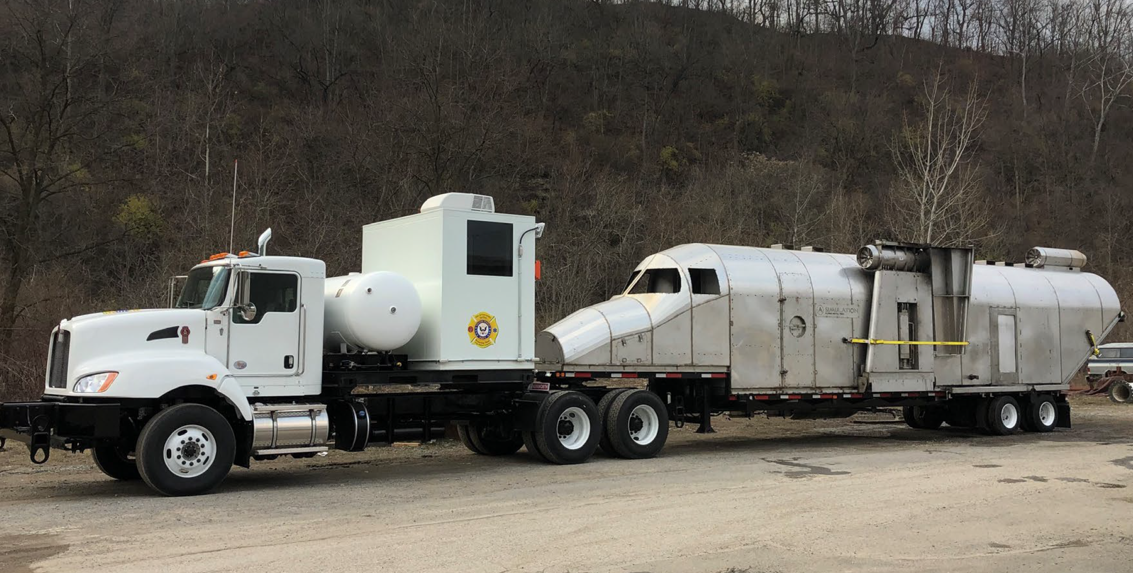Этот мобильный симулятор пожара представляет собой транспортабельный самолет, сочетающий в себе черты истребителя и грузового самолета. Имитатор пожара состоит из двухосного фюзеляжа/шасси автомобильного прицепа и трехосного тягача с установленным сзади съемным пультом управления. Также на шасси установлен 500-галлонный резервуар для хранения сжиженного газа с антикоррозийным покрытием. Комната управления изолирована и кондиционирована. Мобильный авиационный тренажер пожаротушения можно эксплуатировать либо с кабиной управления / салазками для хранения сжиженного газа, остающимися на тягаче, либо поднятыми на землю.
